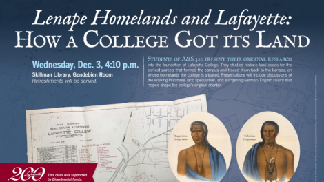 How did parts of the Lenape homeland become Lafayette College? A&S 320 students have spent the semester tracing land parcels back to the earliest purchases to answer this important question. Come see their final presentation and learn about the history of the college.